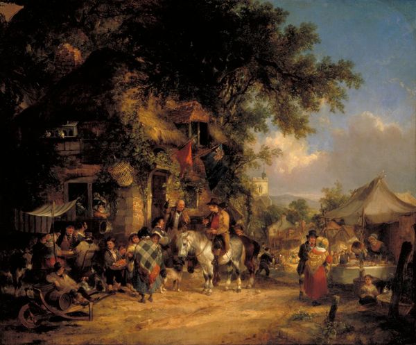 Editor: So, this is "Peasants Dancing and Feasting" painted by David Teniers the Younger around 1660, made with oil paint. It definitely has a lively and joyful mood, almost a celebration in the countryside. I'm struck by how much detail there is in the crowd of figures, all seemingly in motion. What do you see in this piece, taking a closer look at its formal qualities? Curator: Initially, observe the organization of pictorial space. The composition employs a foreground crowded with figures which diminishes in detail and scale towards the background. This recession creates depth but also segments the experience of the painting. How would you describe the paint application, and the role of light? Editor: Well, the paint looks applied in thin layers, kind of smooth but still detailed enough. The light feels diffused and natural; it kind of bathes the scene in this soft glow. It helps to pick out certain figures but doesn’t have a super dramatic effect overall. Does the composition lead the viewer's eye to one particular point or figure, or is that up for debate? Curator: The composition lacks a singular focal point, and instead operates through distributed interest. Each smaller group possesses some moment of visual intrigue; the eye dances through these scenarios without finding rest. The artist uses contrasts of colour and texture to keep you invested. It is this visual tension, these almost frantic energies, that make it exciting. Does understanding the formal properties influence your understanding of its potential cultural function? Editor: Absolutely! By appreciating how Teniers organizes elements like color and light, the scene gets more vibrant. Understanding this painting in its period, it isn't just documentation; the painting style gives energy to these revelers' interactions. I appreciate the way you draw our attention to those details. Curator: Indeed, close attention to form enhances the depth of understanding and helps to unravel not just *what* is represented but *how*.