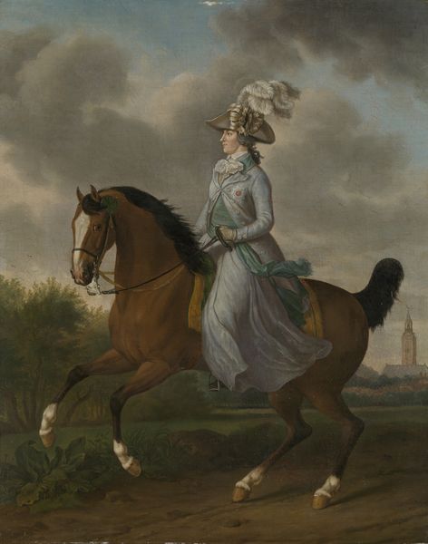 Curator: Looking at this piece, "Frederik V on Horseback," an oil on canvas created by C.G. Pilo in 1754, the grandeur and the weight of power are immediately apparent. This portrait resides here at the SMK, Statens Museum for Kunst. Editor: Wow, it's… impressive, isn't it? It has that distinct old-world charm. A kind of subdued energy, but it still projects power, you know? That rearing horse… he looks so regal, and the sunset-y backdrop sort of romanticizes it all. It is as if he is posing there just to make an statement. Curator: The historical context is key. These equestrian portraits were vital for projecting an image of strength and legitimacy. Think of it as carefully crafted propaganda. It echoes familiar tropes of aristocracy, but Pilo brings a certain… refinement. It has elements of baroque traditions, with their visual complexity. And this composition is very Baroque. Editor: Refinement, definitely. It’s like a power ballad, a show of wealth, strength, and whatnot, with this undeniable air of sophistication. It makes me wonder about Frederik himself. Was he really that commanding, or is it just good art direction? Curator: Consider the time, too. Absolutist monarchies were attempting to negotiate complex social dynamics while facing threats. Representing Frederik in this way sends very deliberate messages about the stability of his reign, visually reaffirming the inherited authority, particularly from the lens of race and class. The racial dimensions of such power are undeniably present. Editor: Absolutely, there's an unavoidable privilege just oozing out of the canvas. It is kind of difficult not to consider the horse, in that regard, being also a show-off of richness, I guess. Anyway, the way the light plays on the horse’s muscles, and the delicate colors, that part's pretty stunning, in the same way it is pretty sad. Curator: The attention to detail in the saddle and bridle versus the relative ambiguity of the landscape, this visual language privileges the monarch above all else, reinforcing a rigid social hierarchy through carefully managed spectacle. It uses the conventions to buttress authority. Editor: A powerful example, indeed. You’ve definitely provided some helpful layers for interpretation. It leaves me pondering the true weight of images like this one. Curator: And maybe to the power of disrupting the weight those images generate.