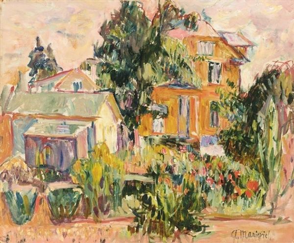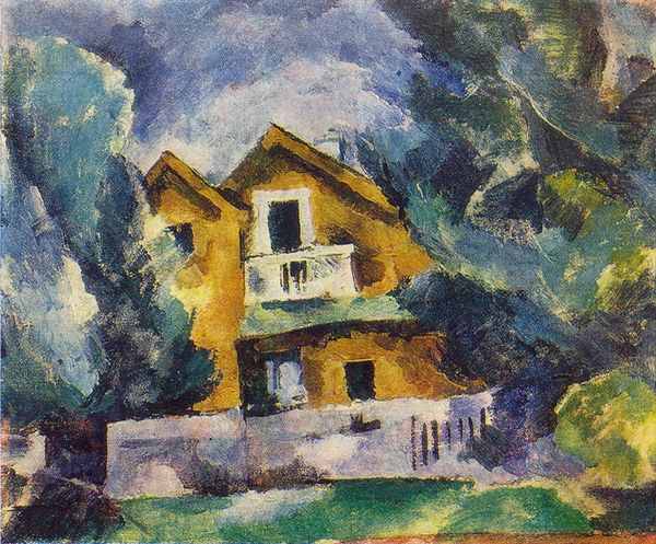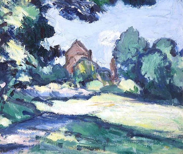 Curator: Gazing upon "Country House by a River", I’m immediately drawn into this scene. The tranquil river mirrors the architecture in the distance so beautifully. Editor: Absolutely, and for viewers just joining us, this painting, crafted with oil paint, invites a moment of peaceful observation. We see brushstrokes filled with light and movement, all while subtly hinting at the changing landscape of France. It whispers of a serene countryside escape. Curator: The water seems to ripple with whispered secrets. Notice the way the building emerges from the landscape, it’s solid yet seems to breathe with the same rhythm of the river. This blending… it softens what could have been just a study of form and line into something that resonates deep in your core. Editor: Indeed. You almost get the impression that Cezanne uses the home and water not merely to portray what he observed, but to present his own philosophy regarding nature and culture. How do humans make a place within nature? It seems to hint towards these broader societal issues of land use. Curator: That feels right. His impasto style is incredibly unique; I find myself thinking about him capturing an authentic sense of time, which is quite thought provoking! Editor: True. With those brushstrokes thick as memories, time somehow condenses. "Post-Impressionism" gives the artist a license to depart from strict replication, allowing expression to dominate the landscape and push past just mimicking reality. Curator: Yes. With the home, light, and landscape, it calls to mind the concept of home: safe, protected, alive. Don't you think that this place feels far more permanent, if not idyllic, for its quietude? Editor: Well, what appears as “quietude” is only how history remembers such settings; these “homes” come to reflect colonial systems that made such landscapes sites of unequal access and private exploitation of formerly shared spaces. As someone studying how art circulates amongst classes, I remain wary when these scenes suggest anything simplistic, such as safety. Curator: I see what you mean, the history, heavy as it can be, shapes our view, doesn't it? Editor: Precisely. I appreciate the nuance that we’re able to draw from a canvas, one that otherwise offers the impression of calm refuge. Curator: Likewise, thinking about those contradictions is part of being present with the painting. Editor: Indeed, art asks us more than it tells. Thank you for your wonderful insights, friend!