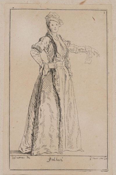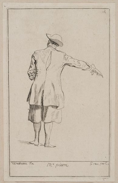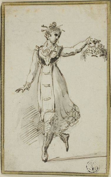 Curator: Ah, a petite figure, almost as if caught mid-gesture, rendered with such delicate lines. Editor: Indeed, this is “Standing Woman Seen from Behind, Wearing a Small Hat,” by A. Claude Philippe de Thubières, comte de Caylus, housed right here at the Harvard Art Museums. The dimensions are modest, just under 6 by 4 inches. Curator: It feels so intimate, like a whispered secret. The count's use of line really draws you into the texture of the dress and that curious little hat. Editor: From a formal perspective, the hatching on the corset contrasts nicely with the free-flowing vertical lines of the skirt, creating visual interest. Curator: I can almost feel the movement of the fabric. She seems to be on the cusp of stepping away, or perhaps beckoning us forward. Editor: It's the precision within such a small format that is so arresting. The composition, though simple, carries immense visual weight. Curator: It's a piece that reminds me that beauty can be found in the fleeting moments, in the delicate balance of form and shadow. Editor: A fleeting moment indeed, distilled into a miniature monument of line and form.