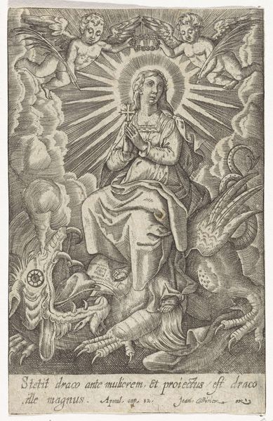Curator: Let’s examine "Hemelvaart van Maria," a print created sometime between 1595 and 1633. Editor: It’s striking! The ascension is rendered with incredible precision, the lines creating a sort of swirling energy around the central figure. The angels almost look like they are carrying her upwards in this delicately engraved scene. Curator: Precisely. What we're seeing here is an engraving, likely by a member of the Wierix family, given its Northern Renaissance style. Note the allegorical elements, such as the dove at the very top, which create an intensely devotional atmosphere. Editor: The landscape below is interesting as well, contrasting the earthly and divine realms, wouldn’t you say? How does this imagery serve its audience? Curator: It is a carefully crafted religious statement for its time. The print presents the Virgin Mary’s ascent in an idealized way meant to evoke deep emotion and underscore her divine grace. The text in the bottom—likely Latin, which would indicate this was directed toward wealthy literate nobles–affirms this, literally spelling out Mary's blessed company during the Virgin’s rise into Heaven. The scale and linear execution of the design underscore this clear message and refined sense of control. Editor: Yes, I see what you mean about control! However, the emotional impact seems, for me, slightly muted, perhaps due to its being a print, rather than an illuminated manuscript. But knowing this would be used for devotional practice definitely deepens how one appreciates it today. Curator: Exactly. It highlights how religious concepts were visualized and circulated to reinforce doctrine. I think looking at its composition helps to consider its historical usage. Editor: And I appreciate understanding its role as a physical object—its method of construction and circulation—contributed to a rich history of Northern Renaissance art.