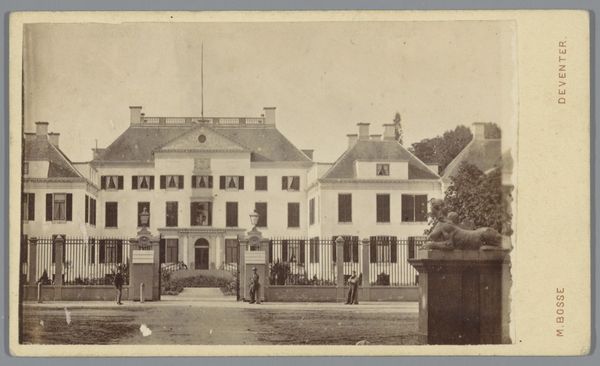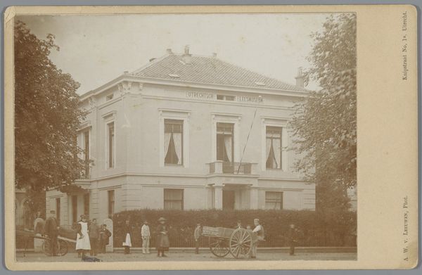 Editor: So this is "Gebouw van de Maatschappij tot Nut van 't Algemeen in de Stationsstraat te Wageningen" taken between 1894 and 1895 by Johan Herman van der Laag. It's a photographic print depicting a building, a cityscape scene in the Dutch Golden Age style. It has this very sepia tone, almost nostalgic feel to it. What strikes you when you look at this image? Curator: The image speaks volumes about social structures and progressivist ideals of the time. The "Maatschappij tot Nut van 't Algemeen"—the Society for Public Welfare—was a key player in shaping Dutch society. This building represents their physical presence but more profoundly their ideological influence. What kind of activities did the Society support, and how were those endeavors seen during that period? Editor: From what I recall, the Society was devoted to educational and social reform... a vehicle for spreading Enlightenment ideas among the working classes. A benevolent project for societal upliftment, or at least, that was how they pitched it? Curator: Exactly. Now consider the photograph itself. It is rendered in sepia tone with architecture dominating the frame. The muted palette emphasizes the somber tones of societal improvement but obscures any challenges. What might be left unsaid or unseen in an image like this? Editor: Perhaps, the voices of those whom the Society sought to uplift? Their experiences, the complexities of integrating Enlightenment ideals into everyday lives… Curator: Precisely! And notice who is included. Are marginalized groups depicted prominently? Analyzing images requires a keen understanding of inclusion and exclusion, as well as a broader picture of history and philosophy of that time. The building symbolizes an ambitious aim—one rooted in intricate power relationships and intersectional layers. Editor: So it is an idealistic representation of power made to look as an ideal image? Curator: You got it. It is something to consider whenever looking at such historical designs, as it reveals social and philosophical power structures through what is not visible in it. Editor: Wow, that shifts my perspective completely!