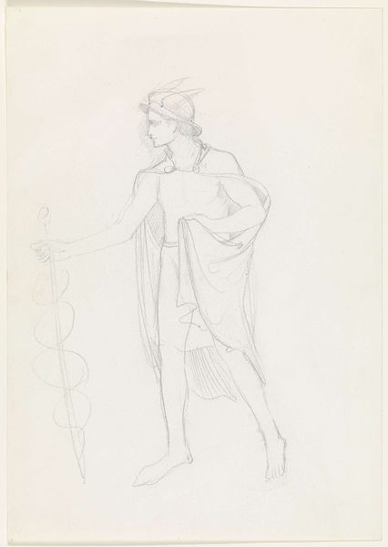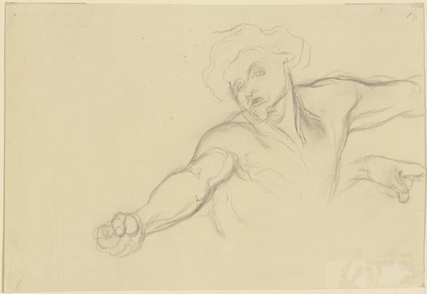 Curator: Here we have Washington Allston's sketch for Jeremiah, intended for "Jeremiah Dictating His Prophecy to Baruch," part of the Harvard Art Museums collection. Editor: My initial impression is one of quiet contemplation, despite the muscularity of the figure. The lines are delicate, almost hesitant. Curator: Allston was deeply influenced by Romanticism, particularly its interest in the individual’s emotional and spiritual life. Jeremiah, a prophet of immense suffering, becomes a vehicle to explore themes of exile and divine judgment. Editor: And yet, there's a classical element in the pose and the attention to anatomy. Notice how the crossed legs create a diagonal tension, mirrored by the pointing finger towards his head. Curator: It’s interesting to consider Allston’s own position within the social and political landscape of his time. As an American artist working in Europe, he navigated questions of national identity, religious conviction, and artistic tradition. Jeremiah becomes an allegorical figure for the artist himself, grappling with his own vision. Editor: The sketch’s incompleteness highlights the process of artistic creation, the movement from idea to form, a tension between what is seen and what is felt. Curator: Absolutely. It allows us to consider the intersection of personal experience and historical narrative. Editor: It's a powerful reminder of the emotional life embedded in form.