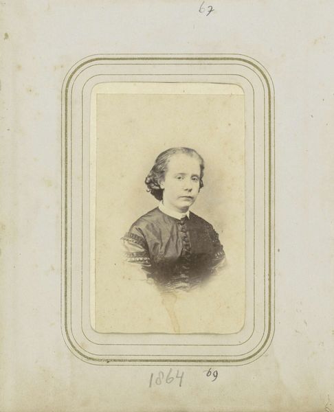 Curator: Here we have an albumen print from somewhere between 1862 and 1889, "Portret van een vrouw met een jurk en opgestoken haar," attributed to Albert Greiner, housed right here at the Rijksmuseum. Editor: It’s strikingly delicate. The tones are so subtle; it gives the whole image a hushed, almost ethereal quality. The frame it’s mounted on also contributes to that feel, so aged, it makes it feel quite intimate like we’ve stumbled upon a treasured personal keepsake. Curator: The rise of albumen prints coincided with photography becoming more democratized. Suddenly, portraiture wasn’t just for the elite; it offered the growing middle classes a way to represent themselves. Consider the performative aspect—clothing, hairstyle—all signals of status and respectability within a rapidly changing society. Editor: And note the framing of her face – soft focus, careful lighting. This enhances certain features, deemphasizes others. Greiner is not merely documenting but presenting an idealized image. Even the texture of the paper, the creamy tones, contribute to the softness, almost like a romantic painting, it certainly speaks of status! Curator: Precisely. The soft focus might be practical, but it also adds to that idealized image. Photography was still establishing its artistic credentials, constantly negotiating its relationship with painting, thus it served a distinct social function within bourgeois culture. Editor: The more I look at it, the more that muted palette appeals. It’s like a symphony in sepia, every tone working in harmony to draw our eye to the subject. The very subtle detailing on the ruffles of her dress—an interesting repetition of gentle curves. Curator: Indeed! An item such as this, presented on display at the Rijksmuseum today, also has to be acknowledged as an index of our current obsession with nostalgia. It has survived so much to be enjoyed by modern museum visitors. Editor: A haunting portrait—so simply yet so elegantly presented, full of hidden detail, of light and delicate composition! Curator: The sitter’s careful presentation—and her carefully constructed image—allows us a glimpse of history, through a lens literally formed through socio-historical shifts.