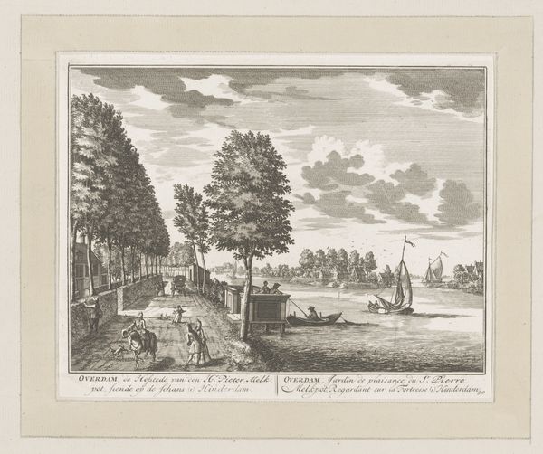 Daniël Stopendaal created this print of Gansenhoef along the Vecht River, using etching techniques. The composition unfolds as a series of horizontal bands, starting from the detailed foreground figures, leading to the middle ground with its tranquil river, and finally, to the atmospheric sky above. This structured layering draws the eye deeper into the scene. The ordered lines of trees create a rhythmic pattern, balanced by the clouds that introduce a sense of drama and movement. This manipulation of space and perspective invites us to consider how landscapes are not just representations of nature, but constructions shaped by artistic vision. The interplay between light and shadow, achieved through fine etching, enriches the textures of the leaves and water, creating a dynamic visual experience. Consider how Stopendaal uses the formal elements of line and space to construct a landscape that is both idealized and deeply engaging.