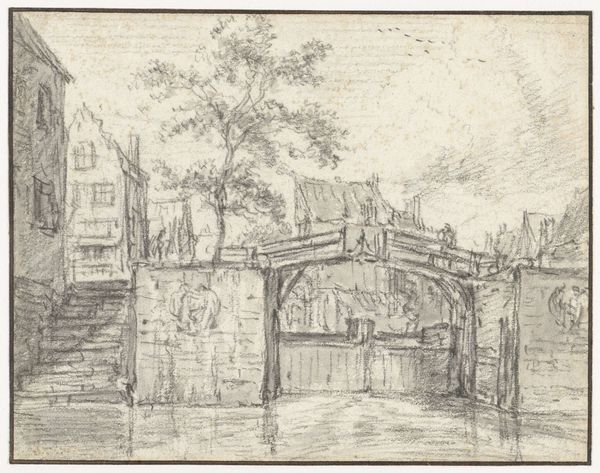 Editor: This sketch, "St. Anthonieswaag i Amsterdam" by Christian Mourier-Petersen, done between 1873 and 1924, uses ink and pencil to depict a cityscape. The buildings seem to huddle together under a cloudy sky. It’s got this quiet, almost melancholic feel to it. What symbols do you see present in the work? Curator: Well, let’s consider Amsterdam itself. The city, with its canals and closely packed buildings, represents a center of trade and cultural exchange, but it also becomes a container for communal memory. The St. Anthonieswaag, historically a weighing house, would have been a place of transactions, a gathering place. Consider, what feelings are evoked by the artist leaving it unnamed or indistinct? Editor: Hmm, the lack of a clear focal point… maybe a feeling of anonymity? Curator: Precisely! This vagueness resonates with the ephemeral nature of urban life. Buildings carry generational memory but fade, crumble or give way to modernity. The marks of ink, almost like faded handwriting, themselves carry a sense of time passing. Even the bridge—think of bridges as a traditional symbol! What might it represent here? Editor: Connection? Or maybe the obstacles of navigating urban life? Curator: Perhaps both. Note also the absence of vibrant colour, which speaks to themes of the everyday, the lived experience. Even in its muted tones, the work echoes the quiet resilience and history embedded within such a familiar scene. Editor: I see now; it's not just a pretty cityscape. It is an echo of the past captured in ink. I'll never see bridges the same way again. Curator: Indeed. These quiet, unassuming works can often be the most resonant. They allow us to reflect on the symbols embedded in our surroundings and understand their enduring power.