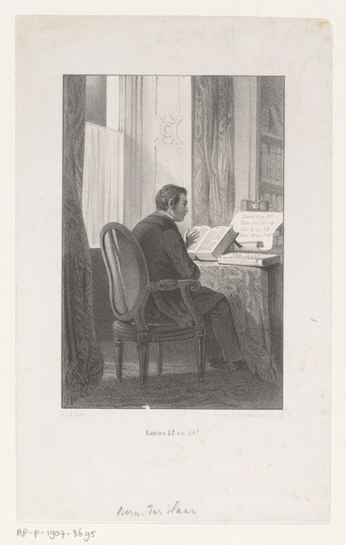 Curator: This is "Lezende man op een stoel voor een tafel met boeken" – or “Man reading in a chair at a table with books” – a lithograph from 1841 by Emile Montigneul. The artist has captured a very intimate and casual pose. Editor: Right! At first glance, it strikes me as… well, supremely bookish, almost to the point of being comically absorbed. The light catches him and that book like it's a stage spotlight, while those others pile up, waiting to be devoured. Curator: It’s interesting you say ‘comical’, because the lithographic medium in this period – especially for a portrait – suggests its accessibility, an image produced for mass distribution rather than, say, a formal commission destined for a private salon. There's almost a caricature at play. Editor: True, and there’s something subtly performative about his intensity. He is presenting himself in a visual spectacle as a true lover of books! I almost hear the rustle of paper and the turning of pages… but beyond that it makes me wonder, what story has captivated him? Curator: Well, it is curious. Consider the composition—the sharp diagonal of his leg juxtaposed with the receding lines of the table and those orderly arranged books suggest a careful consideration of spatial relations, which is not purely representational, it emphasizes his immersion. We also see him sitting down while most traditional portraiture puts people in a heroic pose. Editor: He's definitely claiming intellectual space with a confident slant that says, "Leave me to my thoughts." It’s funny – art often does this: an everyday subject presented in such a way as to force deeper reflection! Curator: Exactly. The texture too. The dense cross-hatching, giving form to clothing and shading to the face, plays an active part. It's about structure and an almost theatrical contrast between light and shadow. It would also highlight the technical prowess possible within the printing process itself. Editor: This makes you see art within the everyday, doesn’t it? Like pausing to note the stories in faces on the bus – those snatched moments of silent drama. To think Montigneul bottled that up on paper over a hundred and eighty years ago! Curator: Indeed! So many intricate layers subtly built into what looks like just another face.