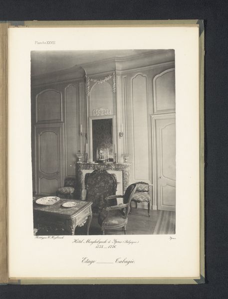Curator: This photograph, "Zitgedeelte van een slaapkamer op de eerste verdieping van Hotel Merghelynck in Ieper, België," was captured by Hector Heylbroeck sometime before 1894. It's a fascinating glimpse into the past, wouldn’t you agree? Editor: It really is! I'm immediately struck by how serene and almost ethereal the space feels. It’s as if time has stood still. The soft light, the ornate detailing, it's all very dreamlike. How does the photographic medium influence your interpretation of this work? Curator: That's an astute observation. You see, photography at that time wasn’t just about documentation; it was also about creating an idealized vision. Heylbroeck seems to be consciously crafting a sense of refined elegance, almost theatrical. What’s really interesting is the use of light and shadow to emphasize the architectural details, making them appear both grand and intimate. Notice how the symmetry of the room almost echoes the symmetry in the photograph itself. Does it strike you as contrived or does it speak more to you of the period’s inherent elegance? Editor: I think it’s a bit of both, actually. It's staged, certainly, but beautifully so. Knowing it was taken before 1894 adds a layer of historical context that makes the image even more compelling. Curator: Exactly. The fact that it's a print also affects the tonality. What would now take seconds to see is an artificially-lit staging that would require the careful arrangement of people and objects, with very specific timings. One has to wonder who the photographer imagines visiting this place in its newly captured version. It's like an imagined memory already! Editor: That’s such an interesting perspective! I hadn't thought of it that way. Curator: Photographs often tell a story that has a little "us" in them too, don’t you think? I think it helps the viewer in trying to identify with that initial intention in the work itself. Editor: Absolutely. Looking at this image with fresh eyes, I’m starting to appreciate the subtleties I missed at first. It's much more than just a photograph; it's a window into another world.