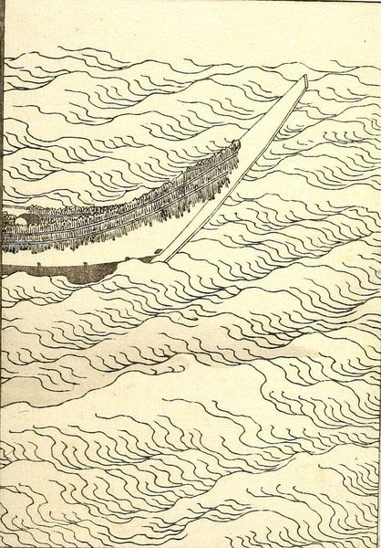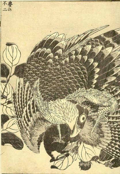 Editor: Hokusai’s "Fuji in a Dream," from his "One Hundred Views" series, features dynamic line work. The mountain is only implied, almost an apparition. What do you see in the symbolism of this piece? Curator: Note how Fuji is rendered as an absence, a void. What feelings does that provoke? This absence speaks volumes about the cultural memory of the mountain as a symbol of permanence, juxtaposed with the fleeting nature of dreams. Editor: It's interesting how Hokusai suggests the mountain without actually showing it. It makes you consider how symbols evolve. Thanks for the insight! Curator: Indeed! And what we bring to them, carrying those visual ideas forward.
