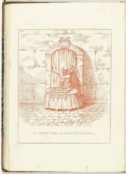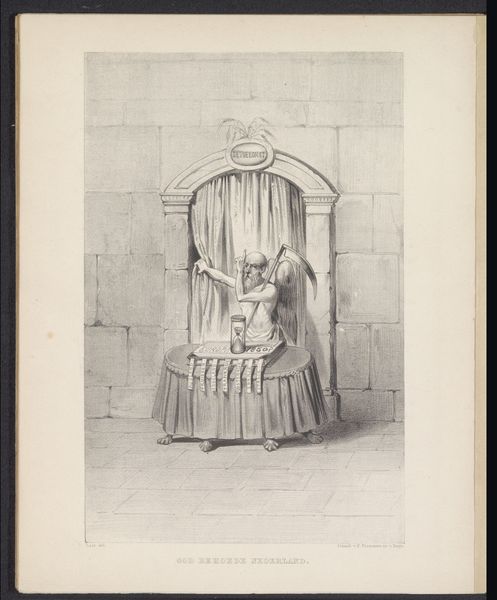 Curator: Let's consider James Gillray's engraving, "Vader Tijd voor de poort naar de toekomst, 1795," created in 1795. What strikes you most upon viewing it? Editor: The starkness, I think. The composition feels severe, almost claustrophobic. The linear quality created by the print medium emphasizes the aged textures and creates a potent visual metaphor of time's inevitable march. Curator: It’s intriguing how Gillray, operating within the Romantic movement, engages with history through the figure of Time. The looming portal, ostensibly to the future, acts as a theatrical backdrop for the symbolic representation of aging and the ephemeral nature of power. He seems to be commenting on societal shifts during this tumultuous period. Editor: Indeed. I read the 'gate to the future' more cynically, like a political cartoon critiquing the naive utopianism that emerged from the French Revolution. Time is shown pushing it open, revealing it’s as much about decline and destruction as progress. And this relates to social shifts: Consider, for example, how engraving as a reproducible medium was crucial in disseminating political ideologies during that era. Curator: Note the figure of Chronos himself. His aged physique, juxtaposed with the instruments of time—the hourglass, the scythe—all seem to embody not only literal temporal passage but also the anxieties of a world on the cusp of enormous change. Do these objects denote that aging is good or bad, especially looking back at this historical turning point? Editor: Ambivalence perhaps? The hourglass is a common symbol, sure, but the added details of coins stacked around it really emphasizes something deeper, that corruption is almost guaranteed. What are those "coins," promises? A critique on societal institutions? Curator: Those coins are a fantastic point of symbolic intersection. If you interpret each stack as the consolidation of power by a political body, and the curtain signifies new leadership, there's some biting commentary about systems. It's interesting how art history and formalism interrelate in instances like this. Editor: Absolutely. It provides context. Reflecting upon this engraving and considering the era in which it was made provides me a new appreciation of Gillray’s craft. Curator: Agreed. Studying how form and context entwine allows us to understand the layers of meaning an image contains, resonating with audiences across time.