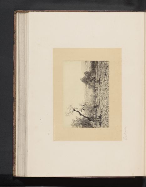 Curator: We’re looking at a captivating landscape print today. It’s called "Gezicht op Genua," dating back to about 1890 and attributed to Alfredo Noack. Editor: My first thought? Nostalgia. There's something intrinsically melancholy about this sepia-toned view of Genoa. It’s faded and warm at the same time. Like an old memory you treasure but can't quite grasp. Curator: I see what you mean, yes. The landscape genre offers itself so naturally to that sentiment! Zooming in closer, one can see that this particular piece is a photograph pasted onto what appears to be aged or even homemade paper. There is the distinct impression of layers here: the substrate of the larger page and the applied photograph—all held within the album’s frame. Editor: I find my eye gravitates to the printed typeface alongside the photographic plate. Those small fonts, thick yet faded, are so charmingly outmoded—with the inconsistent, hand-drawn letterforms creating an anachronistic and strangely warm contrast to the high detail in the photo itself. Do you know, I would hazard that the combination of media underscores its themes: landscape, industry and travel! It feels both of a particular era, yet also reaching out from that time. Curator: Precisely! Noack was really clever, playing with how the new medium of photography could mimic the aesthetics of painting. So much of 19th-century photography looked to legitimate itself as 'art' in that way. Editor: Thinking about Noack trying to capture Genoa around 1890, with the old and the new world meeting at every corner. I can just imagine that. Curator: So true, it really comes through when seeing it like this—so immediate, yet mediated. Thanks for pointing out those dimensions, they really enriched how I see this work. Editor: My pleasure entirely. This piece certainly resonates beyond its composition or its media, stirring that wistful feeling for times that linger just out of reach.