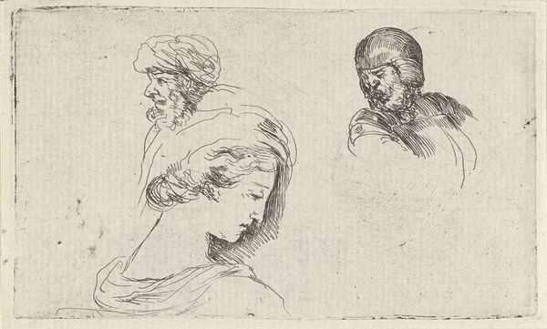 Curator: Here we have "To studiehoveder og en figur," which translates to "Two Study Heads and a Figure," created sometime between 1850 and 1899 by Lorenz Frølich. It’s currently held at the SMK, the Statens Museum for Kunst. Editor: Ah, my kind of controlled chaos! The immediate impression is one of... rumination, wouldn't you say? Three distinct character studies crammed onto the page, like souls trapped in amber, all rendered with a confident hand, but definitely from an artist’s sketchbook. Curator: Absolutely. It appears to be ink or pencil work, maybe even a print based on the fineness of the lines, exhibiting a dedication to draftsmanship characteristic of academic artistic training at the time. We see Frølich, who was a notable illustrator and painter, really wrestling with capturing archetypes. He had a career creating history paintings. Editor: Wrestling is right! Look at that fierce brow on the figure at the bottom—he’s practically a Zeus in miniature, though perhaps one who’s just misplaced his thunderbolt and is supremely annoyed about it. Meanwhile, the woman at the top has the placid sorrow of someone about to be painted as a weeping saint. This all does have a whiff of preparatory study, but for what? The stage perhaps? A particularly grumpy family portrait? Curator: It speaks volumes about the 19th-century artistic practice. Sketches like this acted as a form of visual note-taking, allowing the artist to explore a range of facial expressions and figure types to incorporate these studies into his narrative compositions, informed by classical ideals and historical research. Editor: I'm caught up with his confident crosshatching – he’s squeezing all this expression from pure, dense lines, and I think what intrigues me most is that we can almost feel the pressure of the pencil on the page. It's intimate in that sketchbook way, yet at the same time, distant in its ambition to depict some 'eternal' type. You’ve really got the earthy grandfather with his rebellious, if thinning, locks; the noble sage, with all of the signs of maturity marked on his wise face. I can just feel the wisdom. But then this kind, patient woman who is quietly reflecting… who is she and why is she here? Curator: Considering Frølich's prominent work with illustrations inspired by Nordic mythology and history, it wouldn't be farfetched to posit that he envisioned incorporating such figural characterisations into these grand depictions, aimed to educate the populace and instill a sense of national pride, reflecting both aesthetic conventions and didactic purpose. Editor: A propaganda tool... Now, doesn’t that burst our artistic bubble? In any case, thanks for sharing all that context; it’s certainly helped reveal a little more. Curator: And thank you for sharing your perspectives; it gives these sketches more presence and character.
