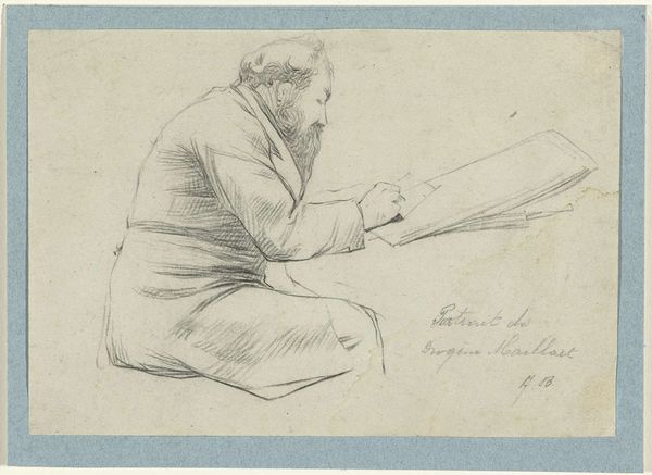 Editor: This is a drawing called "Portret van Paul Verlaine, schrijvend," made in 1892 by Jan Veth, currently housed at the Rijksmuseum. The piece is strikingly intimate; it feels like we are intruding on a very private moment. What do you see in this piece that speaks to its time and place? Curator: It's more than just intimacy; it's a glimpse into the fin-de-siècle anxieties surrounding identity and artistic expression. Verlaine, a controversial figure due to his sexuality and tumultuous relationship with Rimbaud, is presented here not as a decadent icon, but as a worker, toiling at his craft. Consider how Veth, deeply involved in social critique, chooses to portray him. Is this a rehabilitation? A commentary on the labour of artistic genius versus societal perceptions? Editor: I hadn’t considered that angle. I was mainly focused on the academic style combined with an intimate, almost casual, pose. But you're right, presenting Verlaine "at work" is a powerful statement. Curator: Absolutely. Veth was interested in literary and artistic circles and their impact on culture. Here, the figure isn’t romanticized but shown with incredible detail and presence, drawing our eye to the performative aspect of writing itself, even while challenging societal biases and expectations around the artist. Who gets to define the "artist"? Verlaine defied categorisation and challenged the status quo. This portrait subtly captures that spirit. Editor: So it is not only about Verlaine, but also Veth reflecting and commenting on society itself. Curator: Precisely. Art can be, and often is, a profound form of cultural commentary, and a reflection of societal issues like gender roles, class struggles, and racial inequalities. What started as a quick appreciation on its intimism became a deeper view on the complex historical landscape. Editor: This portrait offers a far more nuanced and layered perspective than I initially understood. Thank you.