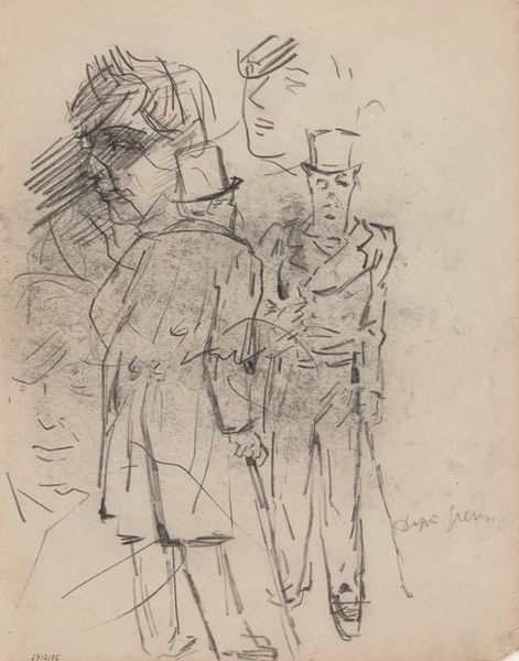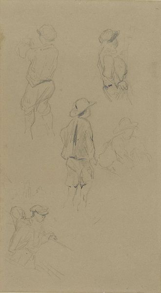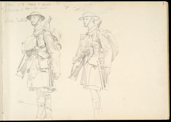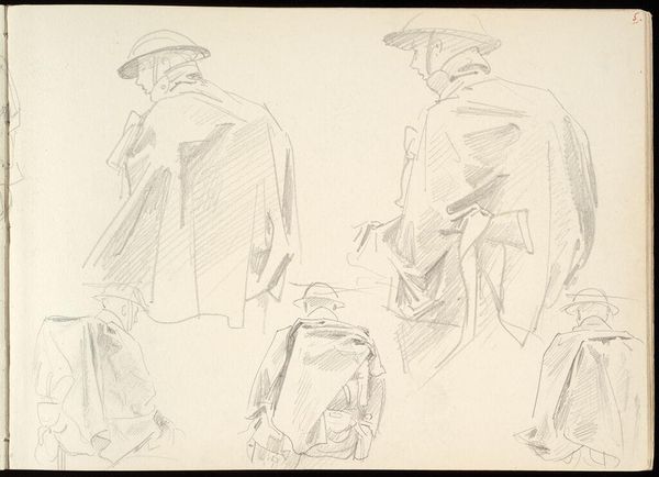 Editor: This is John Singer Sargent's "Sketches of Standing Soldiers," housed at the Harvard Art Museums. It's a pencil drawing, and what strikes me is the somewhat detached portrayal of these figures. What do you see in this piece? Curator: Well, Sargent made these sketches during World War I. Consider the socio-political context: governments used art to mobilize support. But here, instead of glorifying war, Sargent presents a more neutral, observational stance. Do you think this neutrality challenges the typical war imagery of the time? Editor: It does, it feels more like documentation than propaganda. I hadn't considered that. Curator: Right. The sketches show soldiers, but without the usual heroic fanfare, perhaps reflecting a changing public sentiment about war. The Harvard Art Museums' acquisition and display of such works contribute to shaping how we remember and understand that history. Editor: That makes me look at it differently. Thanks! Curator: My pleasure.
