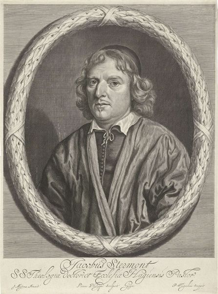 Curator: Here we have "Portret van kunstenaar Adriaen van der Werff," or Portrait of the Artist Adriaen van der Werff, dating from around 1769 to 1775. The artwork is an engraving. What is your impression of this portrait, just looking at it? Editor: It strikes me as surprisingly intimate, considering the formal nature of portraiture at the time. There’s almost a gentle weariness in his eyes. Curator: That weariness may connect to how artists like Adriaen van der Werff were viewed in Dutch society and within broader European cultural movements. The portrait flirts with Baroque aesthetics. Can you discern any Baroque influence here? Editor: I see it in the flowing lines of the hair and the rather theatrical drapery around his shoulders. However, something feels slightly exaggerated here; would you say it leans almost toward caricature? Curator: You've picked up on the artist Colombini's somewhat… interpretive style. He's known for pushing boundaries. Notice the gaze; direct, almost challenging. That communicates something quite potent. Consider, though, that public image was painstakingly managed, and this portrait played a role in crafting Werff's. Editor: It's intriguing to see how those curated images then feed into our understanding of history itself. An artwork that is a product and a reflection of his public persona at that time. How potent are the historical and art references that have emerged from this piece! Curator: Absolutely, the power dynamics at play – who gets remembered, how they’re presented – are essential components of how history is constructed and maintained. And it highlights the complicated game of art appreciation across eras. Editor: I appreciate the artist’s direct gaze at us and our own engagement with history; the intimacy it creates, despite being an object frozen in time. Curator: It certainly prompts consideration, both of the sitter himself, and of the narratives that artwork can construct.