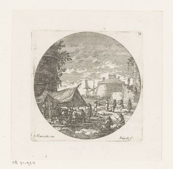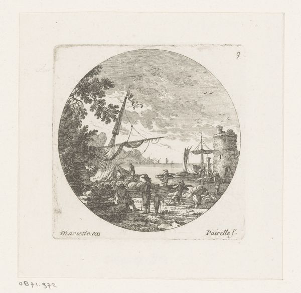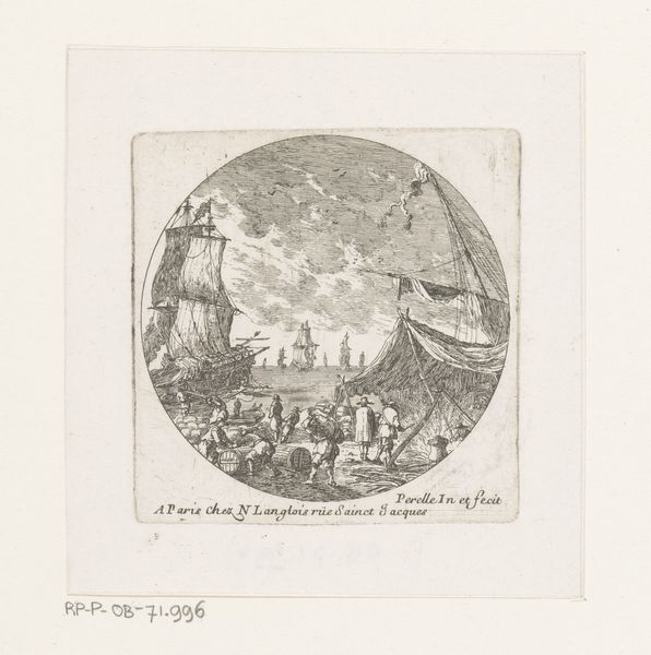 Nicolas Perelle created this print of ships by a quayside, with figures, sometime in the latter half of the 17th century. The etching depicts a bustling harbor scene, complete with ships, figures, and architectural ruins, all framed within a circular format. In this period, the Dutch Republic dominated global trade, and harbor scenes were popular subjects for art, reflecting national pride and economic power. Perelle was French, however, and while this does not depict any particular location it does represent the growing importance of France as a naval power in this period. Prints such as this were often collected in albums, and it is important to remember that museums only came into existence in their modern form in this period. The collecting habits of wealthy merchants and aristocrats drove the production of art in this period. To fully understand prints like this, one might consult period trade records, accounts of naval activities, or even look to the theoretical writings on art academies. These resources can shed light on the economic, political, and artistic contexts that shaped its creation and meaning.