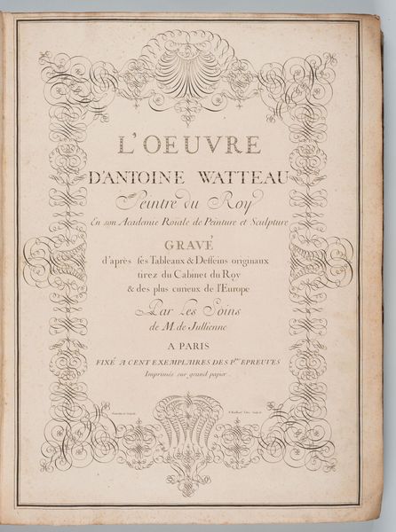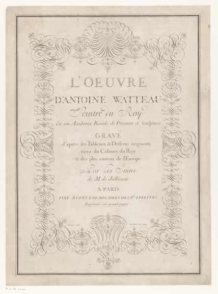 Editor: Here we have an album of prints after Watteau, a large book, almost 2 feet tall. The cover is ornate, just beautiful typography. What's your take on this dedication page? Curator: Ah, yes! This is a glimpse into the world of artistic legacy, isn't it? The swirling calligraphy, framing the title, feels like a stage curtain rising. It hints at Watteau's world, mediated by someone else's hand... almost a bittersweet echo, don’t you think? Editor: Bittersweet? How so? Curator: Well, Watteau died young. This album becomes a memorial, a curated remembrance. It makes me wonder about the act of translation - can a print truly capture the spirit of a painting? Or does it create a new, separate beauty? Editor: Hmmm, a separate beauty...I like that. It is like appreciating a cover song.