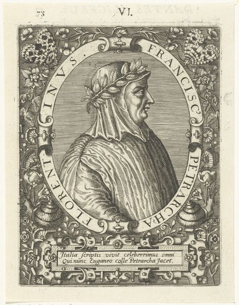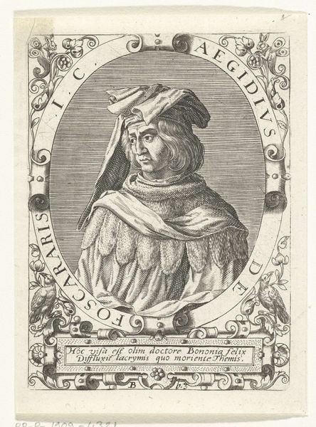Editor: Here we have Theodor de Bry's "Portret van Johannes de Imola," an engraving from around 1597-1599, held at the Rijksmuseum. There's a real sense of Renaissance swagger, even bordering on caricature in his features. What catches your eye in this portrait? Curator: The enduring symbols surrounding Johannes speak volumes. Notice the bees, traditionally representing industry, diligence, and civic virtue, combined with floral motifs suggesting a flourishing life, both personal and professional. They highlight the cultural aspiration of associating individuals with positive societal values. How do these symbols change your reading of his character? Editor: They do soften the impression, somewhat. I initially saw the strong features and elaborate clothing as ostentatious, but the bees suggest something more than mere vanity. What about the inscription? Curator: Indeed. The Latin phrase translates to "If grace follows well-digested laws, then a civic palm will come to your titles." So, De Bry visually encapsulates his status through symbolic language tied to justice, civic duty and success; all anchored in Roman virtue. It speaks to an interesting, visual form of historical record. Is the weight and density of symbols like these what draw you in to study art history? Editor: Yes, exactly! I am really intrigued by how much a single image from the past, like this engraving, can reveal about cultural values of its time. I think I understand a little more about portraiture's relationship with cultural memory and continuity now.