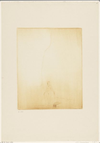 Curator: This delicate drawing, possibly from 1917, is entitled "Bathing Girl on the Banks of the Ganges in Benares," by Wijnand Otto Jan Nieuwenkamp. It’s rendered with pencil and watercolor. What strikes you about it? Editor: It has a haunting quality. The minimalist lines and the vast expanse of untouched space evoke a sense of both vulnerability and profound stillness. The figure seems so isolated within this muted landscape. Curator: Nieuwenkamp, working in the Orientalist style, presents us with a scene imbued with cultural significance. The Ganges River, especially in a holy city like Benares—now Varanasi—holds deep spiritual meaning. A bathing woman carries layers of symbolic weight. How does that inform your reading? Editor: It forces me to consider the gaze. While the style draws from Orientalism, which can be problematic due to its exoticizing tendencies, the simple composition feels almost respectful. Is it documenting a cultural moment, or subtly fetishizing it? Where does representation stray into objectification in pieces such as this one? Curator: Precisely! And we should remember the social context: Nieuwenkamp, a European artist, capturing this intimate moment. The artistic choices—the nude figure, the setting on the Ganges—participate in a colonial discourse that we need to address critically. The 'serene' image then gets tied up with unequal power dynamics. Editor: The act of bathing transcends mere physical cleansing, especially in the Ganges; it represents spiritual purification. It makes me question whether Nieuwenkamp, irrespective of intention, understood and valued the profundity or approached this solely with a voyeuristic impulse? I see the drawing almost as an ethnographic observation, colored with subjectivity. Curator: Nieuwenkamp lived for extended periods in the Dutch East Indies. His engagement with non-Western cultures was complex. While not excusing problematic aspects of Orientalism, we must also examine his works within his specific historical context to reveal social relations of the era. He saw himself, perhaps mistakenly, as understanding these cultures. Editor: This work makes us face those complexities. What begins as a seemingly tranquil scene sparks deeper questions about representation, power dynamics, and cultural exchange. Curator: Ultimately, examining Nieuwenkamp’s work offers critical insight into how cross-cultural artistic exchange can replicate skewed power relationships while expanding the visual language in art. Editor: Absolutely. By deconstructing what might appear like an "innocent" depiction, we unravel deeper significances to art’s engagement with society.