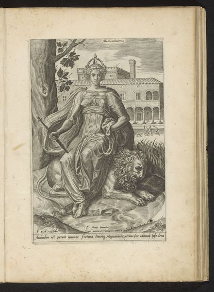 Editor: This is "Geduld", or "Patience," an engraving made around 1560 by Cornelis Cort, currently residing in the Rijksmuseum. There's a captivating stillness to it despite all the symbolic figures— the woman, the lamb, the dragon. What strikes you when you look at this print? Curator: The visual dynamics are quite compelling. Observe the engraving’s intricate use of line. Cort’s calculated arrangements build texture and form. The juxtaposition of the lamb and dragon in the foreground establishes tension within the visual field. How does this controlled composition influence your perception? Editor: I notice the woman's central positioning now, almost bisecting the landscape, lending her prominence, and the repetition of serpentine forms -- in the snakes climbing the trees, the dragon, and even the lamb's fleece. Is that repetition significant? Curator: Precisely. Notice how Cort uses line density to modulate value, thereby sculpting the figures. It emphasizes her quiet fortitude amidst potential turmoil. Note also the contrasting textures -- smooth skin against rough bark. The meticulous execution furthers the theme, wouldn’t you agree? Editor: Yes, now I see the way Cort has contrasted textures and organized visual space serves to focus our attention on the allegory of inner strength through self-control. Thanks for illuminating that for me! Curator: Indeed, it's rewarding to consider how form and content mutually reinforce each other. Exploring how various artistic elements shape our understanding is central to our analysis.