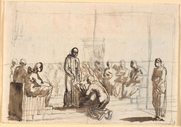 Editor: Here we have Jean Jacques de Boissieu’s "Study of Thirteen Figures" from the 19th century, an etching print. It's a fascinating collection of characters. I'm drawn to the quiet introspection suggested by their various poses. How do you interpret the visual language at play here? Curator: Well, the visual language here, in its starkness, speaks volumes. Etchings like this one often serve as a kind of cultural memory. Think of the ways in which these figures are dressed, their activities... does it remind you of any familiar archetype or cultural story? Editor: I can see echoes of everyday life, perhaps. The woman carrying something, another holding a baby... they feel like snapshots of society. Is that part of their enduring appeal? Curator: Precisely! Consider, also, the weight each pose carries. The slumped shoulders, the averted gazes. Are they conveying hardship? Reflection? Remember that images are never neutral. Editor: That makes me think about how posture communicates unspoken narratives. The way they're arranged on the page creates a community, or perhaps a lack thereof, and adds to this narrative. Curator: And the artist's choices—why thirteen figures? What about their relation on the page to each other, what narrative might that create? The lack of direct interaction begs the question. Images talk to one another, you know. Each pose adds another dimension. Boissieu is crafting not just a study of figures but a meditation on humanity. Editor: So, it is more than just a sketchbook page; it is a record of its time. This artwork has opened my eyes to the silent dialogues occurring within images, those cultural memories whispered through form and pose. Curator: Exactly. And hopefully, you’ll carry that awareness forward when you encounter other artworks. It’s like unlocking a secret language.