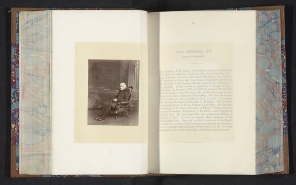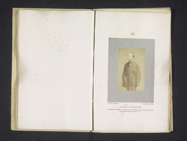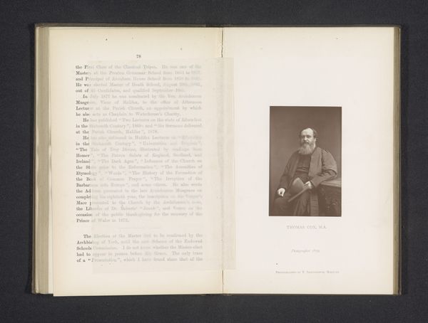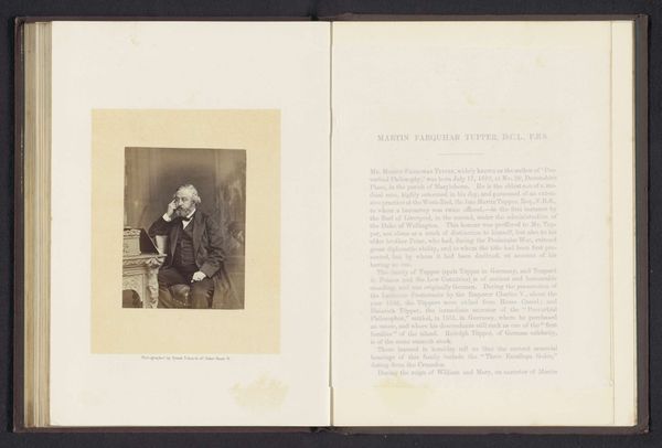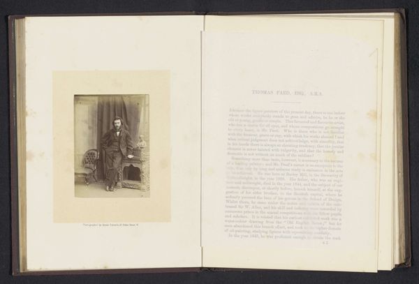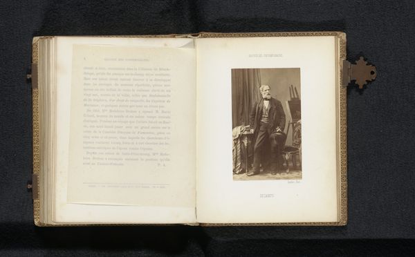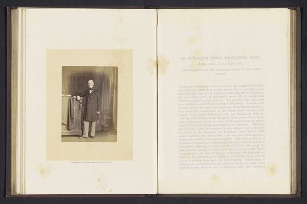 Editor: Here we have "Portret van George Biddell Airy" by Ernest Edwards, dated before 1868. It looks like an old photograph pasted into what appears to be a personal journal or scrapbook. It strikes me as quite formal, very buttoned up. What can you tell me about this piece? Curator: Focusing on its inherent structure, we see a diptych format, a common structural choice for personal albums. On one side, we have a portrait, a rectangle within the larger rectangle, drawing the eye inward with its contrast. On the other, a block of text. What do you notice about the textures at play? Editor: The photograph seems to be fading a bit, adding to the antiquated feel. The aged paper has these interesting discoloration patterns. It creates an overall tone reminiscent of old libraries. Curator: Precisely! Now consider the composition of the photograph itself. The subject is positioned slightly off-center, drawing our eye along a diagonal. How does the composition within the photo work with that broader juxtaposition against the block of text on the facing page? Editor: I see what you mean. It feels very balanced, with the photograph of a man offset by that very imposing block of text. I wonder why the artist chose to frame the photograph within this album. Curator: We can only speculate, but observe the interplay between the visual and the textual. The photograph presents an image, the text a narrative. Does one elucidate the other, or do they function independently, offering complementary facets of a single subject? Editor: That's an interesting point. Seeing them side-by-side like that emphasizes both the visual and textual elements and encourages interpretation. I never thought about that, seeing them in relation to each other. Curator: Precisely! The dialectic is crucial here; it invites a deeper contemplation of form and content.