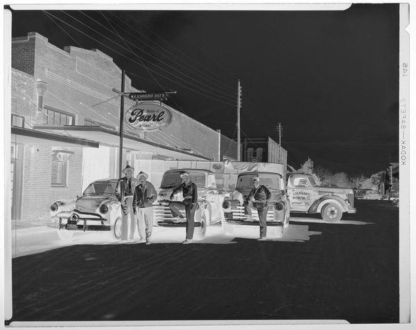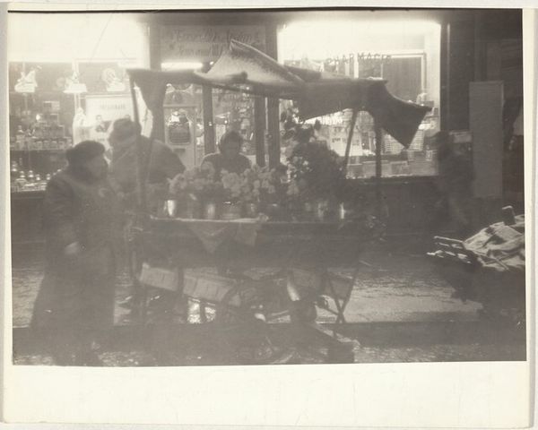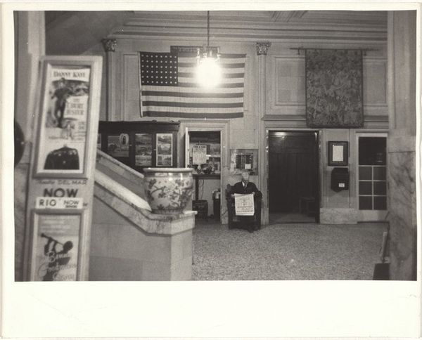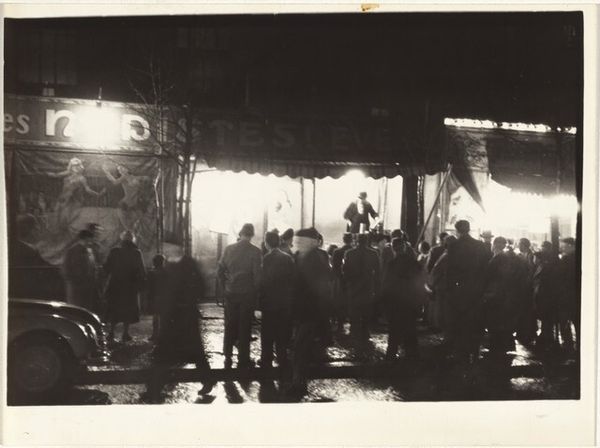 Curator: This gelatin silver print by Peter James Studio captures performers on stage before a seated audience. It’s simply titled “Untitled.” Editor: It has a certain theatrical energy, doesn't it? The high contrast and the framing give it a sense of drama, a visual hierarchy, and interesting textures. Curator: The performers’ costumes definitely draw the eye, especially those patterned fabrics, which speak to particular cultural traditions. There is an element of masquerade here, of archetype, and of cultural expression. Editor: True, but consider also the gaze of the audience and the directionality of the players. The composition guides our eyes through the scene, following the lines of sight. Curator: It’s fascinating how stage performances become a mirror for the audience’s desires and anxieties, reflecting back their own cultural norms. Editor: Indeed. The play of light and shadow contributes to a sense of unfolding narrative. Curator: Ultimately, this image invites us to consider performance as a kind of ritual, a way of embodying and transforming shared cultural meanings. Editor: Yes, and as a purely visual experience, the photograph offers a compelling study in form, light, and the dynamics of space.