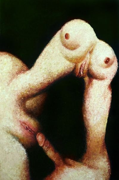 Alexander Roitburd made this painting, "The Parting of Hector and Andromache #5", using oil paint. It's like he's digging into something primal here. The earthy palette, a mix of fleshy tones against that stark black, feels raw, visceral. Looking at the surface, the paint has a really tactile quality. It’s almost sculptural in places, creating this push-and-pull between the figures and the void. There is some intense mark-making at play: the artist uses broad strokes and impasto techniques that build a sense of urgency and emotion. Those little touches of pink, like delicate wounds, amplify the fragility of the scene. This piece reminds me of the emotional intensity you see in some of Francis Bacon's work, but Roitburd brings his own distinct sensibility to the canvas. Like all great art, it leaves you with more questions than answers, doesn't it?