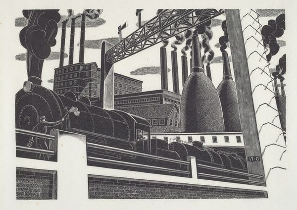Editor: Here we have William Harold Smith’s woodcut, "Underpass," created in 1941. The high contrast monochrome really makes the industrial imagery pop. It feels very much of its time, that Depression era aesthetic. How do you read the socio-political context of this work? Curator: This piece speaks volumes about the era's shifting landscapes, both physically and politically. Look at the inclusion of the WPA sign; it's a direct reference to the Works Progress Administration, a New Deal program. Editor: Right, the WPA was instrumental in employing artists during the Depression, wasn’t it? Curator: Exactly. The government became a patron, shaping artistic production and influencing subject matter. So how does this image of industrialization, mediated by government patronage, strike you? Editor: It’s like the artist is acknowledging the complicated relationship between industrial progress and governmental intervention during the 1940's. The underpass itself seems to symbolize a path forward, even if it's under the shadow of industry and those foreboding clouds. Curator: That shadow is critical. What do you make of Smith's deliberate choice to highlight these elements over others? He could have romanticized the industrial landscape, yet there is a sense of somber acceptance here. Editor: Maybe it’s a reflection on the environmental costs and the human impact of this rapid industrialization? It is more than just documentation. Curator: Precisely. And think about the public role of art at this time. Woodcuts, being easily reproducible, democratized art. Editor: That's a powerful point. The ability to reach a wider audience certainly amplified its social commentary. I hadn’t considered that aspect of the printmaking technique. Curator: I find it endlessly fascinating to see how art is not created in a bubble, but responds to societal shifts. It’s also important to understand how the way art is distributed, like this WPA-era print, influences our view. Editor: Definitely, thinking about art as connected to larger social forces changes my understanding.
