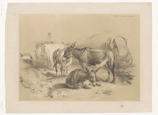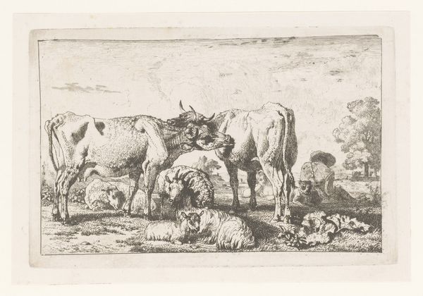 Jean Louis Demarne made this etching of a spinster, child, and bird amidst cows and goats sometime in the late 18th or early 19th century. Demarne’s print utilizes a subtle interplay of light and shadow, achieved through fine, delicate lines. The composition, while seemingly pastoral, reveals a careful arrangement of figures, each contributing to the overall balance. The spinster and child form a counterpoint to the grazing animals, creating a dynamic tension within the frame. Demarne masterfully employs line and texture to differentiate the soft, organic forms of the animals from the more angular shapes of the human figures. Notice how the cloudscape is rendered with looser, more gestural strokes, contrasting with the meticulous detailing of the foreground elements. The work may challenge established meanings relating to nature and labor. What fixed categories are destabilized through its use of a rural scene? The lack of firm, decisive lines and the softness of the work’s textures engage with new ways of thinking about space and perception.