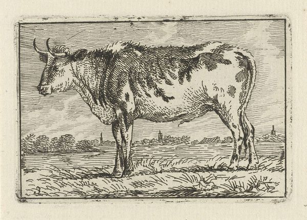 Editor: So, this is "Standing Ox, Facing Left" by Paulus Potter, made sometime between 1645 and 1706. It's a pen and ink drawing. There's something so... ordinary about it. A cow in a field. How should we interpret such a common subject? Curator: The “ordinariness” is precisely the point. Dutch Golden Age art saw a rise in genre painting and landscapes, reflecting a burgeoning merchant class and a new focus on everyday life. What’s the social status of the livestock here? Is it idealized or realistic? Editor: Well, it seems pretty realistic. It's a very solid, weighty cow. You can practically feel the mud under its hooves. But, the backdrop includes a church. Does that pairing say something? Curator: Exactly! Placing the ox in this setting connects it to the prosperity of the time. Cattle were a significant part of the Dutch economy. Look at the confidence of the pen strokes. It elevates the status of this animal. How does this representation differ from say, religious paintings that were once commissioned? Editor: It's like... instead of saints and biblical scenes, we're celebrating the source of wealth. No, these wealthy farmers and landowners can now patronize artists to celebrate the things they consider worth admiring. Curator: Precisely! The politics of imagery are changing. Artists like Potter played a role in shaping public perceptions of value and status. Think about that next time you see an animal portrait. What new perspectives do you have now? Editor: I definitely understand now how an image of something so seemingly simple could reflect larger societal shifts and economic structures of its time. It really shifts my whole view! Curator: Excellent! That's the power of viewing art through a historical lens, understanding the dynamics of art's position in public consciousness.