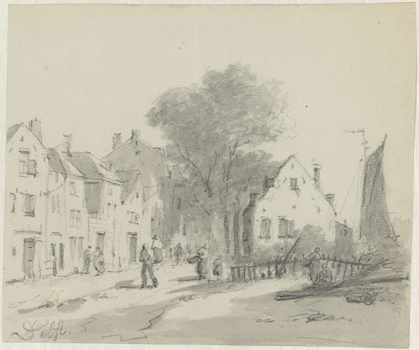 Curator: Looking at this landscape drawing, created sometime between 1700 and 1800 by an anonymous artist, my first feeling is melancholy—a quiet street, the light so gentle, it feels like a forgotten corner of time. Editor: It is a spare scene. The artist used only pencil, yet look at how much information is communicated! The drawing’s composition details the labor of building, the shaping of materials like wood and tile into habitable spaces, that become more, spaces imbued with personality, history. Curator: Exactly! It almost feels like standing there, you can sense the everyday lives unfolding in those homes. There's a dreaminess too, wouldn't you say? Perhaps the anonymity contributes, allowing viewers to project their own village or sense of "home." Editor: Perhaps. But notice how the repeated shapes of the roofs and windows show the reality of standardized construction, where costs and access to materials would greatly impact not only the final visual experience, but the literal experience of home dwellers through structural integrity or efficient space designs. Curator: While the repetition has practical roots, doesn't it also build a comforting visual rhythm? It gives a sense of unity to the whole scene. The small differences from roof to roof keep the view interesting. You find those quirks in villages all over the world that give an area an inimitable feeling. Editor: Yes, and thinking about who created it... We don’t know their name, but this cityscape offers insight into Dutch life during that period, which also says something about class structures and systems of artistry. This pencil drawing represents the lives, experiences and hands, paid or not, that came together to manifest Westkapelle, in Walcheren. Curator: You make a good point. I imagine them stopping for a while on their journey, perhaps on the way to the sea, pencils and sketchbooks out to grab a portrait of a time or a mood. This particular glimpse is very calming; I appreciate its gentle tone more than ever. Editor: Me too, now I’m considering how this artwork may reflect on the Rijksmuseum’s ability to collect and protect not just monumental oil paintings or precious jewelry, but fragile everyday things and stories.