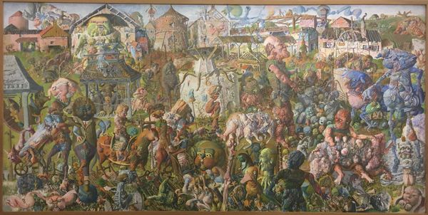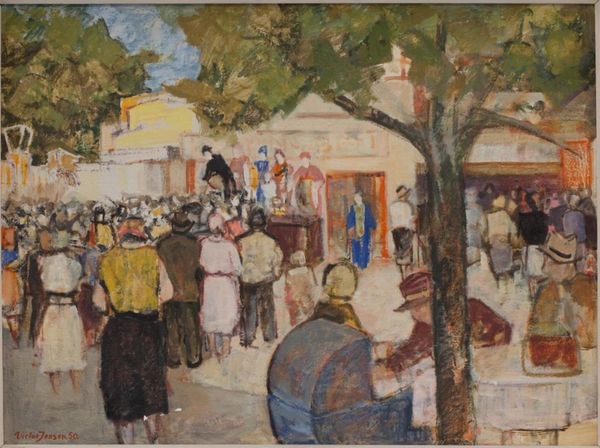 Curator: Standing before us is Konstantin Alexeevich Korovin's "With Bears in Siberia," painted in 1921. It's a dynamic oil painting reflecting Russian genre painting and landscape traditions. Editor: Whoa, look at that bear! Front and center, like he's the guest of honor. The colors are so vibrant; it feels like a chaotic celebration bursting with energy, almost a dream state with blurred figures. Curator: Indeed, the composition is quite interesting. The layering of figures, buildings, and that elevated fortress creates a tiered effect, pushing back into a complex perspective. Note also how Korovin employs impressionistic brushstrokes to convey movement and texture. Editor: Absolutely. It’s loose, almost frenetic! Look at the people—just dabs of color, suggestions rather than portraits. But the bear, while similarly rendered, has a real presence. Is he dancing? He almost looks like he’s mimicking human posture. Curator: The painting's focus might reflect the social context. By 1921, Korovin had been working more as a stage designer. The figures could reflect players, performers, costuming. The bear itself has an artificial and theatrical, rather than wild presence, a staged encounter perhaps alluding to old Russian traditions. Editor: That resonates! It’s like he’s placed a raw, wild symbol—that bear—into this staged spectacle. It is, perhaps, some deep connection of humans to nature. I am strangely hypnotized by how something that is blurred, unfinished-looking is still a captivating emotional painting. Curator: Precisely. The semiotic value is in the bear, as it mediates Russian identity, whilst existing within this tableau vivant of avant-garde brushstrokes. Editor: For me, it feels like capturing a fleeting memory. This canvas reflects what it must have been like to be an ordinary person with those memories living in that space and time. Curator: An evocative summary. Editor: I think I need to go sketch something! Thanks.