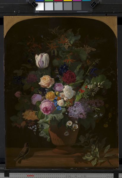 Editor: Here we have Jacob Vosmaer's "A Vase with Flowers" from 1613, currently at the Metropolitan Museum of Art. It's an oil painting, and I am struck by how much depth the dark background adds to the whole composition. It feels almost staged. What historical context should we keep in mind while viewing it? Curator: Indeed, this still life exists within a rich social and political landscape. Paintings like these, especially during the Dutch Golden Age, transcended simple depictions of beauty. Consider the patronage system; these works weren’t made in a vacuum. Who commissioned them, and what did these flowers symbolize to the aspiring middle class? Editor: So, you're saying it’s about more than just liking flowers? Curator: Precisely! It speaks to burgeoning wealth and a desire for status through consumer goods. Notice anything unusual? Editor: I see a tulip that's almost… striped? Curator: A sharp eye! These were 'broken' tulips, highly prized and wildly expensive at the time during the tulip mania. By placing it so prominently, what could Vosmaer be commenting on? Was it celebrating newfound financial freedoms, perhaps also commenting on the absurdity of speculating flower markets? Editor: It feels like there's both admiration and maybe a bit of a wink involved, a commentary on fleeting beauty and, maybe, financial instability. It makes me consider what symbols will communicate those issues in *our* time. Curator: Absolutely. Appreciating the socio-economic context really transforms our perception of this otherwise simple bouquet. It compels us to think about art’s broader cultural influence, doesn't it?