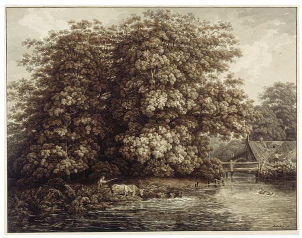 Editor: So, here we have P.C. Skovgaard's "Træerigt landskab med en sø og tre børn der står og fisker," a watercolor landscape from 1845. It feels very… peaceful, almost idyllic. The light is soft and the colours are muted. What do you see in this piece? Curator: I see a careful construction of Danish identity. Consider the period: 1845. Denmark was defining itself. Landscapes like these became powerful symbols. Do you notice how the fishing children are integrated almost seamlessly? Editor: They seem to almost blend in with the landscape itself. Curator: Precisely. It evokes a sense of harmony between the people and the land. Fishing, of course, is also symbolic - sustenance, tradition, perhaps even a gentle metaphor for Denmark drawing life from its own soil. Editor: That makes sense. I hadn't thought about the political implications of what seems like such a simple scene. What about the prominent stork's nest to the left; is there an implicit symbolism? Curator: Ah, good eye! Storks are traditionally symbols of good fortune, family, and new life, so the pairing of these figures presents us with continuity, abundance, and a deep connection to the land. How interesting that it appears to hover over the next generation! Editor: That is truly a beautiful reading. So much meaning packed into what I first perceived as just a pleasant scene. Curator: Indeed. Skovgaard masterfully uses these images to root a national narrative in something both timeless and deeply personal.