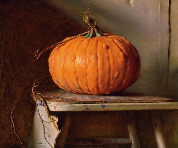 Editor: So, here we have *Gourds, Bricks, and Block with Hand*, an oil painting by Daniel Greene. The title itself makes me think of construction, like setting up a building site. Yet it feels so staged and unnatural… almost like the fruits and vegetables have been dethroned. How do you interpret this work? Curator: Well, immediately, I’m drawn to the use of ordinary objects – gourds, bricks – elevated through the act of painting. The placement of such raw, rough and even imperfect elements into this still life feels deliberately arranged to be observed, doesn't it? These gourds have been harvested and positioned within a tradition, while also becoming democratised subjects themselves. Editor: So the historical setting really adds another layer? Curator: Precisely. Think about the art world as a hierarchical space, defining which artists are worthy of attention and support. Greene presents us with these mundane objects and seems to ask the audience a crucial question: who or what shapes this sense of artistic and historical worth? Editor: Interesting! The piece really highlights that objects themselves become vessels of worth only when displayed in a particular setting... kind of like in a museum like this one. Curator: Exactly! By placing the pumpkins into this almost contrived landscape, Greene hints at a critique of artistic merit, bringing to mind themes of social equity. It is an almost subversive action using realistic and familiar visual language, and subverting tradition from within, wouldn't you say? Editor: I see what you mean, these aren't the usual pristine subjects you see in fine art, and stacking up mundane objects is a clear way to create artistic and social statements. Thanks, I hadn't looked at it that way before. Curator: My pleasure. Art invites all kinds of perspectives and dialogues, but these dialogues can also alter the power that the image might seem to hold, at first glance.