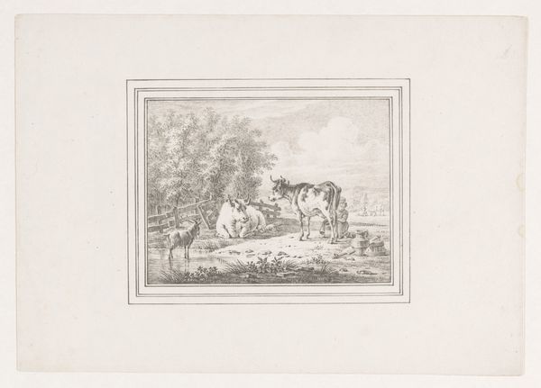 Jean Louis Demarne created this landscape with two sheep using pencil and brush, sometime between the late 18th and early 19th centuries. Demarne was known for his landscapes and genre scenes, often depicting everyday life. In this quiet scene, we see two sheep resting in a field; one stands alert while the other lies down. The intimate portrayal of these animals evokes a sense of pastoral simplicity, yet it also speaks to the socio-economic structures of the time. The sheep, symbols of agricultural wealth, were central to the rural economy. This work reflects the period's fascination with country life and the idealized vision of nature. It's interesting to consider how Demarne, as an artist, positions himself in relation to his subject. He doesn't simply document; he interprets, shaping our understanding of the relationship between humans, animals, and land.