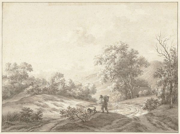 Editor: So, this is *Landschap buiten Haarlem*, or Landscape Outside Haarlem, an engraving by F.W. Musculus made sometime between 1747 and 1758. The details achieved through engraving are incredible! I notice how carefully the artist depicted a rural scene with figures going about their daily lives and rabbits, evoking a really calm feeling. What can you tell us about the setting and people presented in this artwork? Curator: It’s fascinating how a seemingly straightforward landscape reveals so much about its socio-cultural context. Look closely – how is labor depicted? Do we see idealized peasants or a more realistic depiction of the rural working class? The positioning of Haarlem in the background is significant too. It presents the city as this entity looming over a tranquil foreground of agrarian daily lives. Do you think this engraving presents a picturesque escape from urban life or makes a subtle commentary on their interdependence? Editor: I suppose it could be both, an escape and a reminder! The city being in the distance suggests escapism, but the figures remind us about labor necessary to uphold that city. I also notice that the human figures are smaller than animals, and the trees look bigger than any of them! I would not have imagined it being such a deep perspective. It also shows an unequal relationship between mankind and the nature they inhabit. Curator: Exactly. Engravings like this were also instrumental in shaping ideas of national identity and collective memory, shaping how the public understood and related to the countryside. Think about it – this isn't just a scene, it’s a carefully constructed *image* of Haarlem and its surrounding lands designed for consumption and interpretation. Do you see how this print contributed to a broader visual culture? Editor: Definitely. Thinking about it, I can see that a work like this shows not only nature and daily life, but also makes us aware of society and our role as citizens of the state and appreciators of nature and art. Curator: Precisely! And by recognizing those complexities, we can appreciate this tranquil landscape as something more profound. Editor: I've never looked at baroque landscape in this manner. Thank you for shining a new light on what these works can mean in relation to us and society!