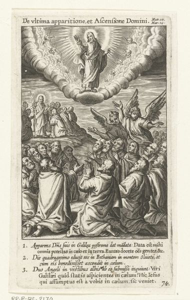 This engraving, made by Theodoor Galle, depicts Christ's ascension into heaven. Radiating light emanates from Christ, whose raised hand is a gesture of benediction and power, reminiscent of classical depictions of emperors. The apostles below, awestruck, mirror the tradition of depicting witnesses to divine events. The motif of ascension appears across cultures, such as the soaring figures in ancient Roman apotheosis scenes, or the elevated saints of the Byzantine era. It represents the soul's flight from earthly constraints. This upward movement is a visual metaphor for spiritual transcendence, tapping into a collective yearning for elevation and purification. In each telling of the motif, whether religious or secular, there is a consistent desire to visually express the human spirit’s aspiration towards the divine. The ascension captures humanity’s eternal aspiration to transcend earthly limitations, a powerful force in human consciousness.