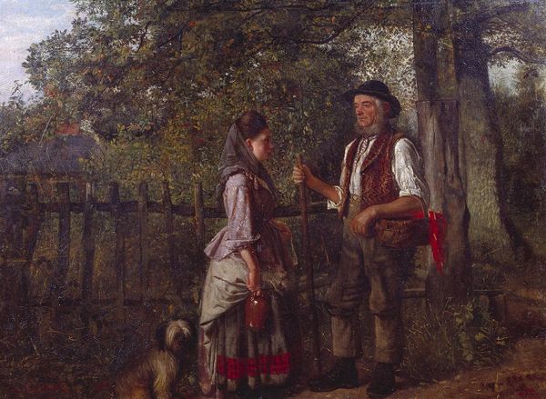 Editor: Here we have Vilhelm Kyhn's "I lysthuset," or "In the Gazebo," painted around 1858-1859. The artist worked in oil on canvas. The painting presents three figures relaxing in a garden, seemingly engrossed in different thoughts and activities. I'm particularly drawn to the contrasting expressions. What strikes you most about this piece? Curator: Well, isn't it like stepping into a shared daydream? I see not just a genre painting, but a whisper of societal currents flowing through the Danish Golden Age. Each figure seems a little island, a moment suspended. Look at the lilac – a classic symbol of first love, yet there's a pensive air. Do you get a sense of unspoken stories, Editor? Editor: Absolutely! The man with the newspaper looks rather detached, almost weary. It's more than just a pretty scene; there’s a hint of melancholy perhaps? Curator: Melancholy... precisely! Or maybe just the quiet complexity of human connection. I almost feel I could join them and then just like that be completely on my own within their circle. Also, think about the rising nationalism; the choice of a sun-drenched Danish garden perhaps acts as an idyllic stage for domestic life... and the newspaper maybe whispers news of broader events, outside the gazebo walls? Editor: That's fascinating! It’s like the artist captured the push and pull between private joys and public concerns. Curator: Precisely. And consider this too: it speaks of a growing middle class and their desire for representing their lives of comfort, yet infused with something much deeper. Isn’t that the magic? The comfort with that tiny thread of existential awareness woven through it? Editor: It is indeed. I will remember it now seeing it not as a snapshot but a little slice of history painted on canvas.