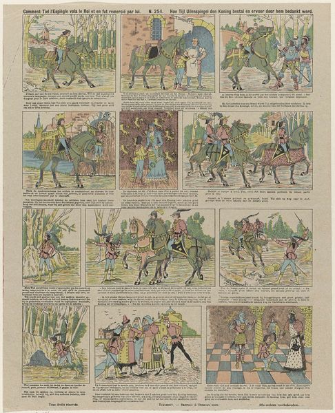Editor: This artwork is titled "De betooverde prinses", or "The Enchanted Princess," created sometime between 1876 and 1900. It’s a watercolor print and seems to tell a story through sequential images, almost like a comic strip. There’s something both charming and slightly unsettling about the visual narrative. What's your take on it? Curator: Unsettling is a good word. The playful Art Nouveau style certainly charms, but underneath, don’t you feel a whiff of the uncanny, perhaps like stepping into a dream slightly gone awry? It reminds me of leafing through a childhood book only to realize the characters have a sly wink in their eyes now that I’m older. Editor: Definitely! What strikes me is the depiction of animals behaving like humans—what does that mean to you? Curator: Well, anthropomorphism, assigning human traits to animals, has always been a way for us to explore aspects of ourselves from a safe distance. It’s the oldest form of character building, the ability to judge other people and also examine our place within hierarchies, customs and laws. Are those creatures mirrors reflecting our follies back at us? What's it reflecting? The absurdity and theatricality of courtly life maybe? I feel invited to consider not just what the artist wants us to see, but *why*. Editor: So it's a sort of whimsical social commentary. I was focused on the surface narrative, but I now realize the artist wants us to question the whole theatre of status. Thanks for helping me look deeper. Curator: My pleasure! Art should feel like a delicious invitation to an ever-evolving feast, don’t you think? There are always new ways to experience and feel the art with you.