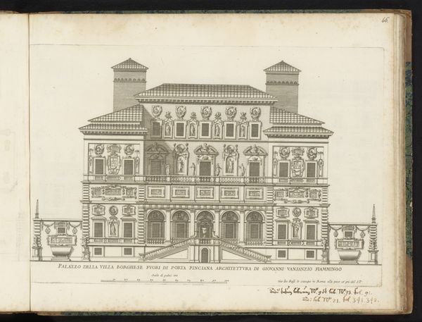 Isaac Ware's "Section of the East Front, Houghton Hall, Norfolk" presents a rigorously structured architectural drawing executed with ink on paper. The work is dominated by a symmetrical composition, emphasizing the clean lines and geometric forms that define classical architecture. This cross-sectional view invites us into the internal organization of space, revealing a structured hierarchy of rooms and levels. The cool monochromatic palette underscores the drawing’s analytical precision, which serves not only to depict but also to dissect the building’s anatomy. Ware's approach reflects the Enlightenment’s emphasis on reason and order, seeking to uncover the underlying principles of architectural design through detailed representation. This drawing functions as a semiotic system where each line and plane signifies not just a physical element but also an idea about proportion, balance, and the rational use of space. In this way, Ware’s drawing transcends mere depiction, becoming an exploration of architectural philosophy.