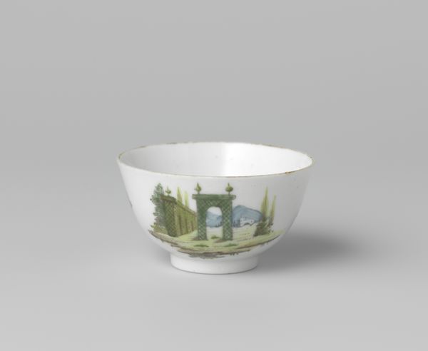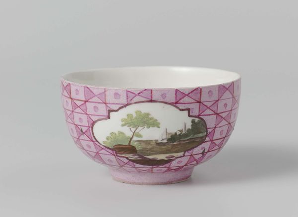 Editor: So, this is a porcelain teacup, part of a larger tea and coffee service made by Loosdrecht before 1778. It’s decorated with little figures in a river landscape, all in this beautiful beet-red color. It’s delicate but the landscape imagery also gives it some depth. What's striking about this object to you? Curator: I’m immediately drawn to the materiality of it. We’re looking at porcelain, a highly prized commodity in the 18th century. Loosdrecht, a Dutch manufactory, was trying to replicate the coveted hard-paste porcelain from Asia and places like Meissen. Consider the labor involved: from sourcing the raw materials to the skill required for painting these tiny scenes. This wasn't just about drinking tea; it was about displaying wealth and participating in a global network of trade and consumption. Editor: That's fascinating. I hadn't really considered the global aspect of it. I was mostly focused on the painted scene itself, a little genre painting in miniature. So, how does the choice of the landscape scene relate to the social context? Curator: Well, landscape imagery provided a safe subject for the rising bourgeoisie, in that period, who sought to signal their access to leisure. Owning such porcelain was a deliberate choice. Think about it - did they portray explicit wealth in the paintings, or create landscapes that would be inviting and serene for a teatime chat? Editor: The landscape certainly speaks to an appreciation for nature and perhaps a desire for tranquility. Curator: Precisely. And beet-red is a fascinating color choice too, as that could also affect its reception and even pricing in its day, speaking again to the value attributed to specific material features. Thinking about the processes and the hands that made it allows us to view a teacup, as more than just a delicate item, it embodies stories about trade, taste, class, and artistic ambition. Editor: That definitely gives me a richer appreciation for the cup. I see it now as a small window into a whole world of 18th-century society. Curator: Exactly! Now, consider this lens while you study any new works from that time period.
