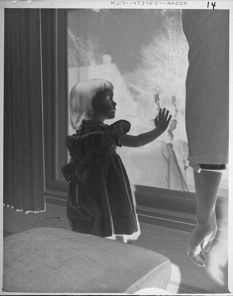 Curator: This silver gelatin print, made by Lucian and Mary Brown, captures a small child peering out from behind a curtain. The image is titled "Untitled (little girl behind curtain)" and measures approximately 5 x 4 inches. Editor: The high contrast and grainy texture almost obscure the subject. It's interesting how the soft fabric of the curtain contrasts with the hard, planar surface of the floor. Curator: Note how the curtain acts as both a threshold and a veil, a classical symbol of concealment and revelation. What secrets might be hidden or revealed? Editor: I wonder about the material of the curtain itself. Was it mass-produced, readily available, or something carefully chosen? Its simple presence frames the entire scene. Curator: The figure emerging suggests an unveiling, a moment of emergence. The child's expression, though not perfectly clear, speaks of a joyous arrival. Editor: Yes, and that speaks volumes about the Browns' artistic practice, thinking about all the labor and decisions, big and small, involved in its making. Curator: Absolutely, it's a powerful visual moment captured through a seemingly simple scene. Editor: It certainly makes you consider the everyday materials that shape our experiences, and how photographic images like this preserve them.