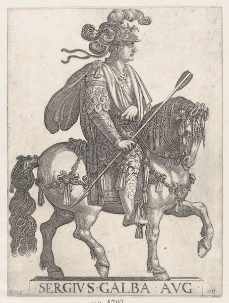 Editor: This is "Portret van Madame d'Etampes te paard," or Portrait of Madame d'Etampes on Horseback, created around 1538-1544 by Cornelis Anthonisz. It’s a mixed-media print – etching and engraving. I'm struck by how the detail of her clothing contrasts with the slightly stiff pose of both the woman and the horse. What catches your eye? Curator: Well, beyond the obvious portrait of a noblewoman, what's intriguing is how this image positions her within the complex socio-political landscape of the time. Consider the function of prints during the Renaissance. How were they used to disseminate power and influence? Editor: So, this wasn't just about capturing her likeness? Curator: Precisely. The medium of print made it possible to reproduce and distribute her image widely. We should ask: what does it mean to see a woman, Madame d'Etampes who was the mistress of Francis I, portrayed in such a commanding pose on a horse? Is this a deliberate statement of power, reflecting the shifting roles of women in the 16th century, or simply a fashionable display of status? Think about the institutions of power and how they would be represented to the public. Editor: It's like a carefully constructed image to project her influence. Almost like an early form of propaganda, maybe? Curator: In a way, yes. We could even consider it a visual assertion of her political and cultural capital. Editor: I hadn't considered that. So much more than just a portrait. Curator: Indeed! Examining the print within its historical context illuminates how art can actively participate in shaping public perception and solidifying social hierarchies. Editor: I'll never look at a portrait the same way again. Thanks!