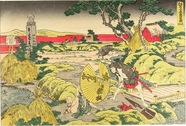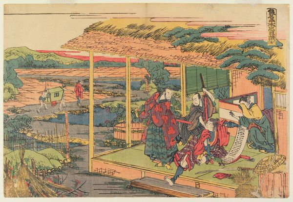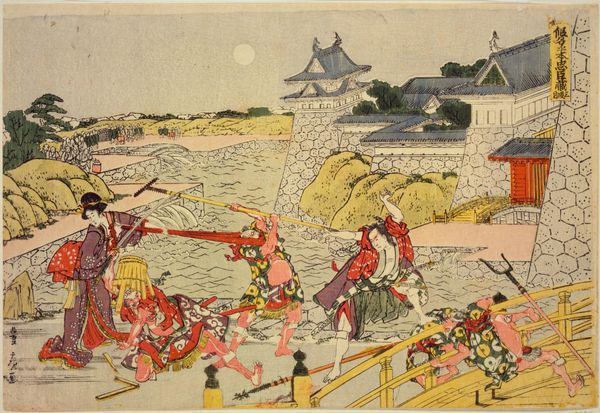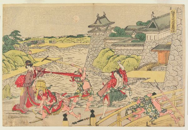 Curator: Hokusai's "Act V," circa 1806, immediately strikes me as chaotic. The figures, compressed within this flooded landscape, exhibit a stark dynamic contrast. What's your initial perspective? Editor: Chaotic, indeed. The sheer density of detail, all those swirling lines! And I'm struck by the apparent tension between labor and leisure represented in the figures here—their clothing, activities. Curator: Absolutely. We see the convergence of ink and woodblock print, the medium contributing significantly to the linear emphasis defining forms and delineating space. Note how the wood grain itself interacts with the landscape. The interplay of figure and ground also establishes a powerful narrative. Editor: Thinking about materiality, it's not just the wood grain; the very choice of the wood itself! Was it easily accessible? What labour was involved in the cutting of the block, transferring the design, and finally, the printing itself? It seems important to the value placed upon it. Curator: A crucial consideration! Semiotically, we can also dissect the various visual signs here—the swords, the ruined bridge—and investigate their codified meanings within the broader social text of Edo-period Japan. Observe, too, Hokusai's manipulation of perspective. Editor: True, but it seems crucial to consider that perspective was influenced by economic forces shaping woodblock print production, consumption of entertainment and printed material. This print may be related to labor; that labor informs every mark and line within the image, its existence hinging upon the economy that it relies upon. Curator: That point is certainly not dismissible. Viewing it structurally, we note how he repeats certain motifs and gestures that rhythmically connect diverse parts of the composition. Editor: Right, so when contemplating art, its meaning extends beyond pure formalism; it requires engagement with material, economy and labour of making art itself! Curator: A compelling synthesis, reminding us to always to re-evaluate our perception of art. Editor: Absolutely, every line bears an echo of production—the physical making.