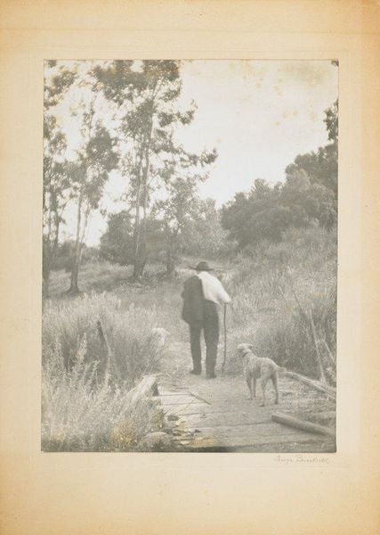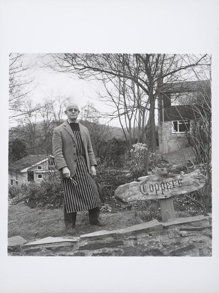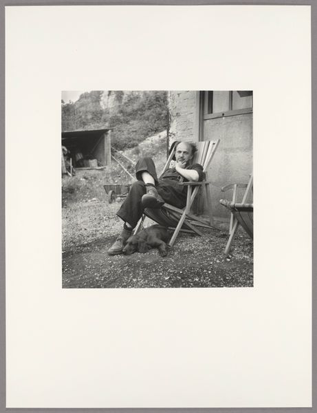 Curator: This is Keith Arnatt's photograph, "Walking the Dog," now held in the Tate Collections. It looks quite ordinary at first glance. Editor: Ordinary, yes, but there's an undeniable pathos. The man, the dog, both seem weary, marked by time and toil. Curator: Arnatt often explored the mundane, elevating it to a subject worthy of artistic attention. Think about the labor involved in producing even a simple image like this, the choices of film, camera, and printing techniques. Editor: And the symbolism—the dog as a loyal companion, representing fidelity, perhaps even a stand-in for the artist himself, tethered to routine. Curator: Routine, exactly! Arnatt questioned the hierarchy of art, suggesting everyday activities are as valuable as grand narratives. Editor: I see in their shared gaze a connection to something deeper, a timeless bond between humans and animals. There's an echo of classical portraiture, stripped bare. Curator: Perhaps Arnatt wanted us to confront the value we place on the extraordinary versus the lived experience. The materials are simple, but the conceptual weight is significant. Editor: Indeed. It’s an image that resonates long after you look away.