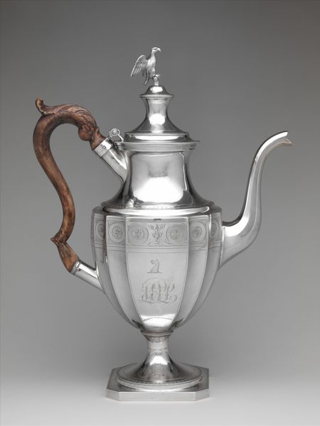 Curator: Ah, a beautiful piece. This is an urn, crafted by Henry Chawner, who lived from 1750 to 1850. Editor: It's so...contained. Like a silver tear about to spill. That dark green spigot only amplifies the feeling. Curator: The urn, a symbol of mourning and memory, evolved over time. It became less about ashes and more about stylish serving. Think of punch or, dare I say, a potent spiced wine. Editor: Yet the material resists easy comfort. The coolness of silver paired with that very formal, almost heraldic, crest...it feels distant. Curator: True, the crest suggests a very specific lineage, a family’s story etched in metal. This object broadcasts status and refinement. Editor: It’s interesting how functional objects can carry such loaded symbolism. The weight of history, quite literally, in your hands. Curator: Yes, a silent witness to gatherings, secrets, and perhaps even heartaches. It’s a tangible echo of lives lived. Editor: It’s elegant and melancholy all at once.