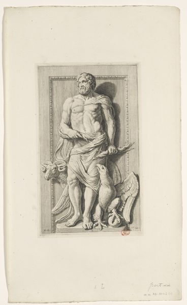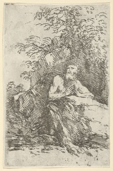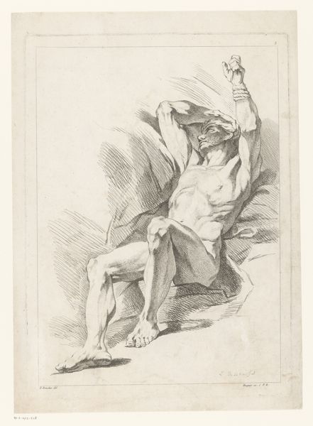 Curator: Here we have Johann Elias Ridinger’s 1728 etching, “Zittende krijgsman met ontblote borst,” which translates to “Seated Warrior with Bared Chest.” It’s part of the Rijksmuseum’s collection. Editor: The first thing that strikes me is the line work—it's so delicate, yet creates such a muscular figure. He looks utterly defeated. Curator: Ridinger was known for his animal studies, particularly horses, but he also produced many allegorical and historical prints. This piece showcases the Baroque era's fascination with classical antiquity and the male nude. He has a laurel wreath so it looks like he has divine status or kingship. Editor: I'm curious about the physical process of creating this image. You can almost feel the pressure of the etching tool as it bit into the metal plate. How would the labor of this print compare with a commissioned portrait from the period? The intended audience certainly differs. Curator: Good question. The print medium makes the artwork more widely available than, say, a unique painting. Its accessibility allowed for the spread of certain ideas, or ideals like in this print. The mass production through printmaking democratized the image, shaping public taste and disseminating propaganda. Editor: The social context shapes my view of the work. To our eyes, this seems like an idealized or possibly homoerotic nude, but maybe this man stands for loss and lament—like some biblical character brought low through hardship. Curator: Absolutely. Prints such as this, during the rise of academies, allowed for the transmission of artistic ideas and for artistic training, especially with the study of anatomy. The work speaks of history painting and moral lessons—valor lost, perhaps? Editor: Right. Thinking about the etching process and the warrior’s bare chest, the making of this print isn’t too dissimilar from how that man may have once dressed or armed for war: through successive layers and a lot of physical, demanding, hand-to-object work. Curator: What a compelling observation! Viewing it this way makes you realize that while Ridinger depicted a warrior, his work participates in the culture that idolizes militarism, even after conflict has destroyed it. Editor: It really opens up what we're seeing—an intricate network of manual labor, the printing press, classicizing, artistic styles, and public reception all coalesce. It’s more than meets the eye at first glance.