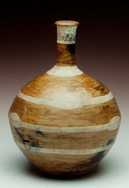 Editor: Here we have a ceramic vase made by Shimaoka Tatsuzo, around the 20th century. The subdued earthy tones give it a rustic, almost ancient feel. What symbols or stories do you think it might be holding? Curator: What immediately draws my eye is the intentionality behind what might seem like a simple, everyday object. It's not just a vase; it’s a vessel of cultural memory. Consider the incised texture on the body of the vase— the patterns are so meticulously repeated. Do you think it echoes textile patterns or perhaps even cord markings from Jomon pottery, some of the oldest earthenware known to Japan? Editor: I can see that, the marks almost give it a tactile feel. So you think it connects to even earlier Japanese artistic traditions? Curator: Precisely! The artist invites us to ponder our cultural origins through this unassuming form. In essence, it embodies *mingei*, the Japanese folk-art movement philosophy which highlights beauty in everyday objects. Editor: So, beyond its simple appearance, it encourages us to recognize the rich history ingrained within it? It makes you wonder about the symbolism even in its silhouette. Curator: Yes! The shape itself -- a sturdy body capped with a slender neck -- represents containment and controlled release. The artist understood, intuitively, that an image resonates far beyond its immediate appearance, acting as a symbolic reservoir of shared experience. This continuity creates a powerful link between the maker, the object, and the beholder across time. What did you glean? Editor: It's definitely broadened my appreciation of this vase from purely aesthetic, into also considering artistic intentions and Japanese cultural visual language.